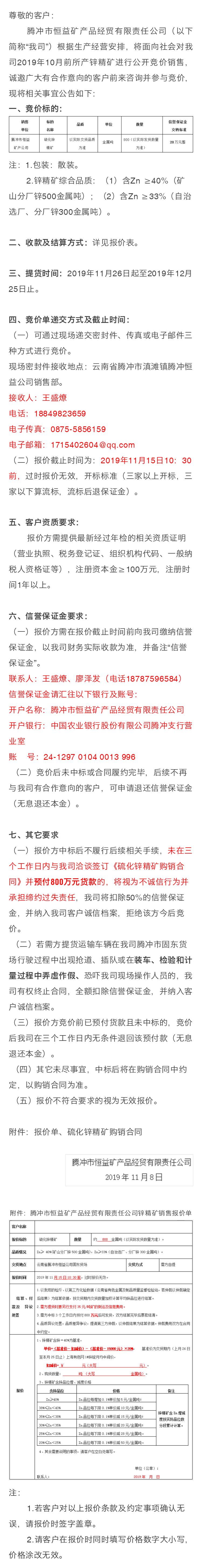 騰沖市恒益礦產(chǎn)品經(jīng)貿(mào)有限責(zé)任公司關(guān)于鋅精礦競(jìng)價(jià)銷(xiāo)售公告(201911)號(hào) 來(lái)源: 瀏覽量:10573 日期:2019-11-11 分享到: 上一篇:高黎貢國(guó)際健康旅居小鎮(zhèn)低層住宅八組團(tuán)江山小院室外市政工程施工招標(biāo)公告 下一篇:騰沖市恒益礦產(chǎn)品經(jīng)貿(mào)有限責(zé)任公司關(guān)于鋅精礦競(jìng)價(jià)銷(xiāo)售公告(201910)號(hào)