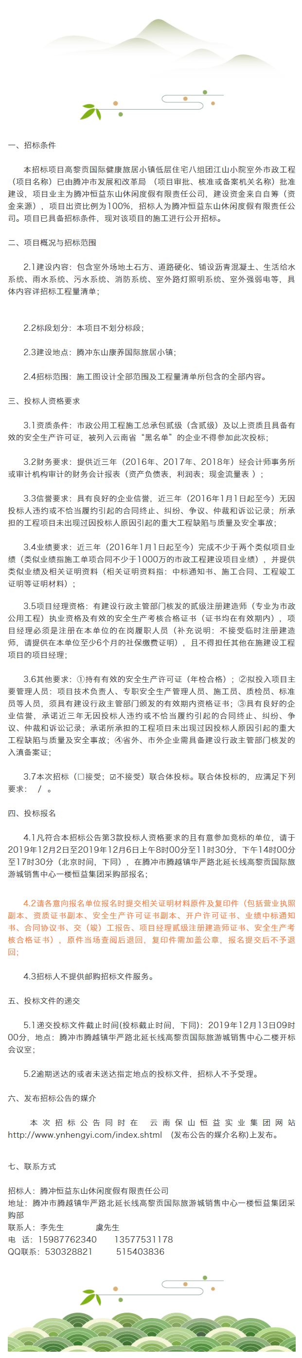 高黎貢國際健康旅居小鎮(zhèn)低層住宅八組團(tuán)江山小院室外市政工程施工招標(biāo)公告 來源: 瀏覽量:10184 日期:2019-12-02 分享到: 上一篇:高黎貢國際健康旅居小鎮(zhèn)低層住宅八組團(tuán)——景秀東山A區(qū)建筑消防工程施工招標(biāo)公告 下一篇:騰沖市恒益礦產(chǎn)品經(jīng)貿(mào)有限責(zé)任公司關(guān)于鋅精礦競價銷售公告(201911)號