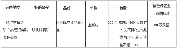 騰沖市恒益礦產(chǎn)品經(jīng)貿(mào)有限責(zé)任公司(以下簡稱“我司”)根據(jù)生產(chǎn)經(jīng)營安排,將面向社會(huì)對(duì)我司2020年10月前所產(chǎn)鋅精礦進(jìn)行公開競價(jià)銷售,誠邀廣大有合作意向的客戶前來咨詢并參與競價(jià),現(xiàn)將相關(guān)事宜公告如下: