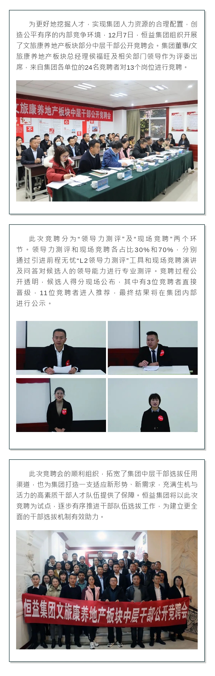 恒益集團文旅康養(yǎng)地產(chǎn)板塊部分中層干部公開競聘會議順利召開 來源: 瀏覽量:6605 日期:2021-12-08 分享到: 上一篇:恒益集團第二屆董事會第四次會議舉行 下一篇:恒益集團景秀東山項目品鑒會成功舉辦