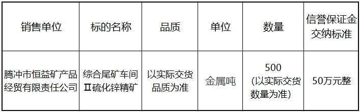 騰沖市恒益礦產品經(jīng)貿有限責任公司關于鋅精礦競價銷售公告(202310)號