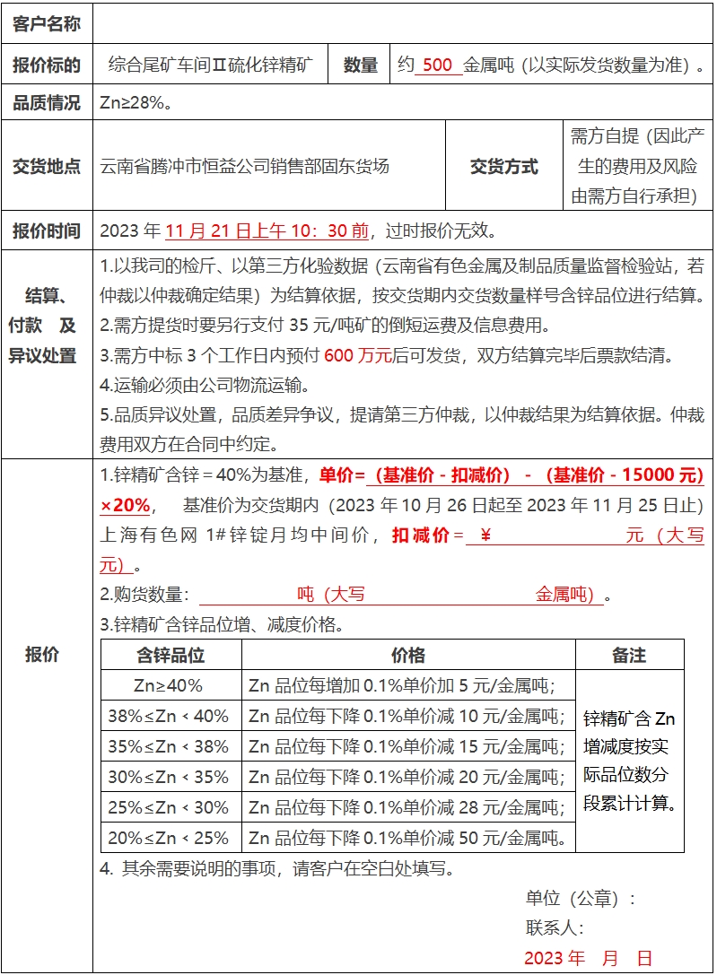 附件:騰沖市恒益礦產品經(jīng)貿有限責任公司鋅精礦銷售報價單