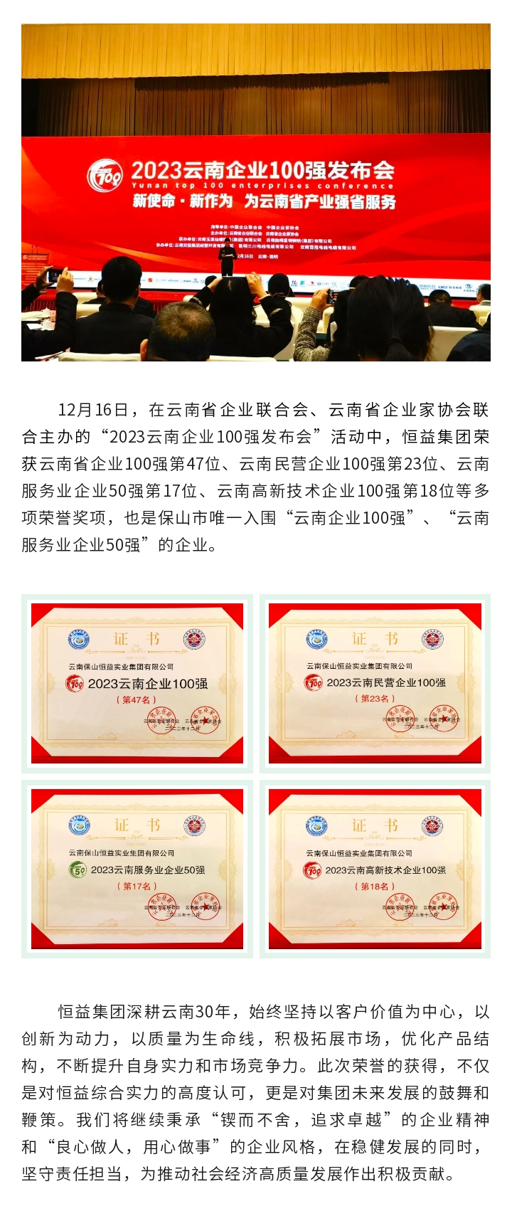 喜訊丨恒益集團(tuán)獲得“2023云南企業(yè)100強(qiáng)”等多項(xiàng)榮譽(yù)獎(jiǎng)項(xiàng) 來(lái)源: 瀏覽量:4868 日期:2023-12-16 分享到: 上一篇:考察聯(lián)誼謀發(fā)展,合作共贏譜新篇 下一篇:騰沖市恒益礦產(chǎn)品經(jīng)貿(mào)有限責(zé)任公司滇灘鐵礦東排土場(chǎng)建設(shè)項(xiàng)目環(huán)境影響評(píng)價(jià)公眾參與第二次信息公示