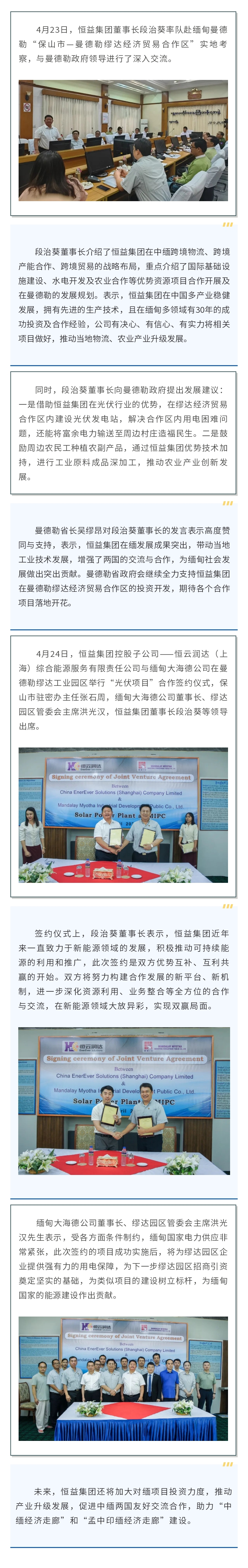 恒益集團(tuán)董事長(zhǎng)段治葵率隊(duì)赴緬甸曼德勒考察,簽署“光伏項(xiàng)目”合作協(xié)議 來(lái)源: 瀏覽量:5383 日期:2024-04-26 分享到: 上一篇:五一浪漫打卡點(diǎn)丨恒益南玫莊園玫瑰采摘節(jié) 下一篇:云南保山恒益實(shí)業(yè)集團(tuán)有限公司與云南保山產(chǎn)業(yè)園區(qū)管理委員會(huì)簽訂戰(zhàn)略合作協(xié)議