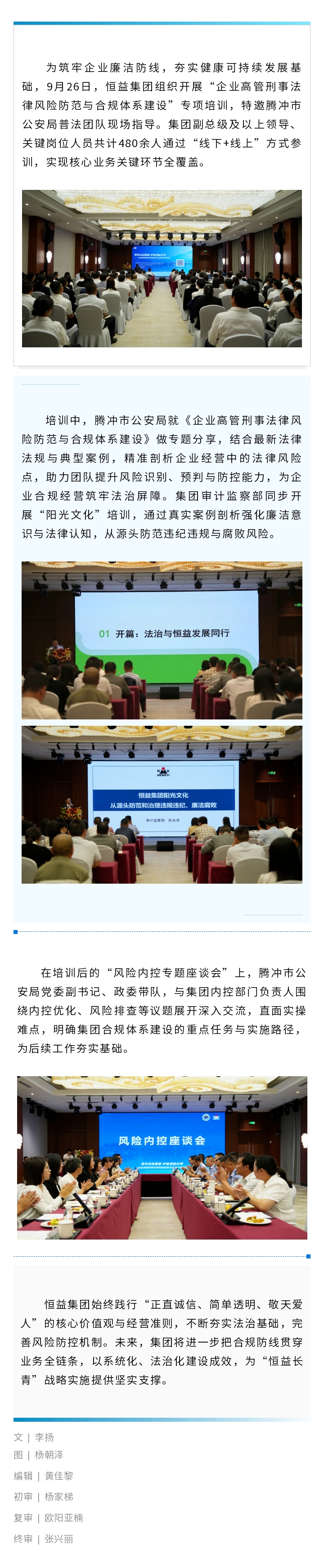 恒益集團(tuán)開展高管刑事法律風(fēng)險(xiǎn)防范與合規(guī)體系建設(shè)專項(xiàng)培訓(xùn) 來源: 瀏覽量:1217 日期:2025-09-28 分享到: 上一篇:恒益集團(tuán)黨委赴松山抗戰(zhàn)遺址開展主題黨日活動(dòng) 下一篇:榮登雙榜!恒益集團(tuán)榮獲2025云南民企百強(qiáng)第30位、服務(wù)業(yè)20強(qiáng)第8位