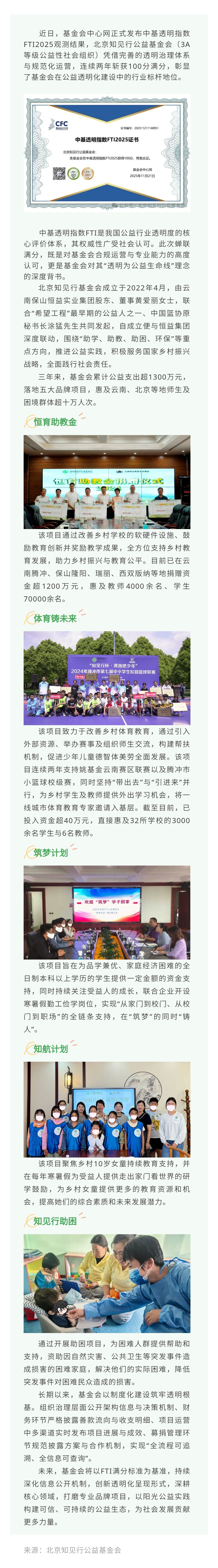 北京知見(jiàn)行公益基金會(huì)再獲中基透明指數(shù)FTI2025滿分 來(lái)源: 瀏覽量:356 日期:2025-11-26 分享到: 上一篇:恒益集團(tuán)攜手中輕國(guó)際 共筑康養(yǎng)產(chǎn)業(yè)合作新篇章 下一篇:溫泉中醫(yī)賦能旅居云南,旅居與醫(yī)康養(yǎng)創(chuàng)新發(fā)展論壇重磅嘉賓及議程公布